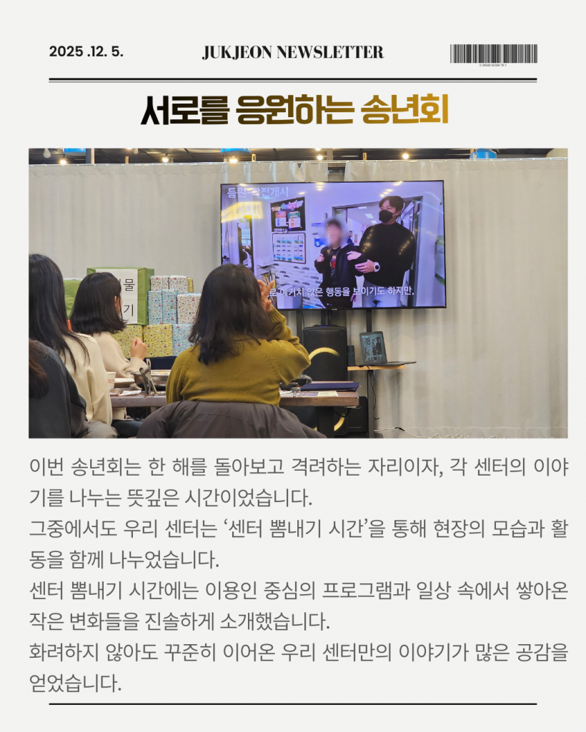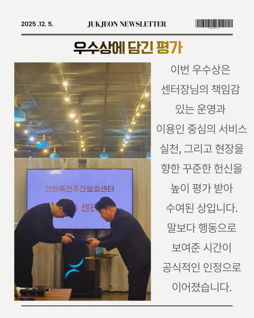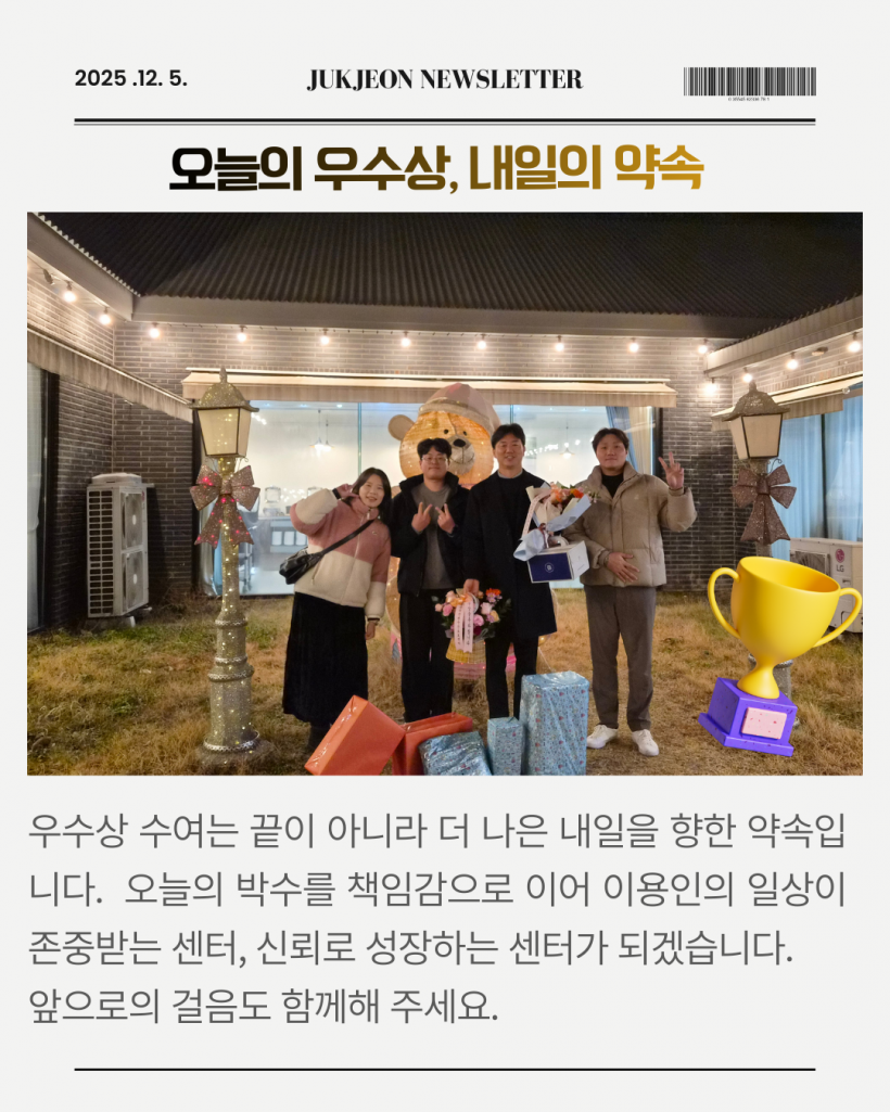송년회에서는 각 센터의 이야기를 나누는 ‘센터 뽐내기 시간’도 함께 진행되었으며, 센터장님이 걸어온 운영의 방향과 철학이 소개되어 더욱 뜻깊은 시간이 되었습니다. 이번 수상을 계기로 앞으로도 흔들림 없는 운영과 따뜻한 리더십으로 센터의 하루를 지켜가겠습니다. 많은 응원과 관심 부탁드립니다.