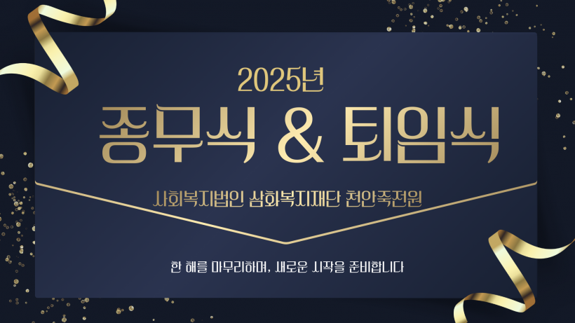2025년 사회복지법인 삼화복지재단 천안죽전원 종무식 & 퇴임식 페이지 정보 작성자 운영자 작성일25-12-31 13:33 조회174회 댓글0건 관련링크 목록 본문 2025년 사회복지법인 삼화복지재단 천안죽전원 종무식 & 퇴임식을 진행하였습니다.항상 천안죽전원 가족분들의 얼굴에 웃음꽃이 활짝 피실 수 있는 죽전원이 되겠습니다!다가오는 2026년 새해 복 많이 받으세요!감사합니다. 댓글목록 등록된 댓글이 없습니다. 목록