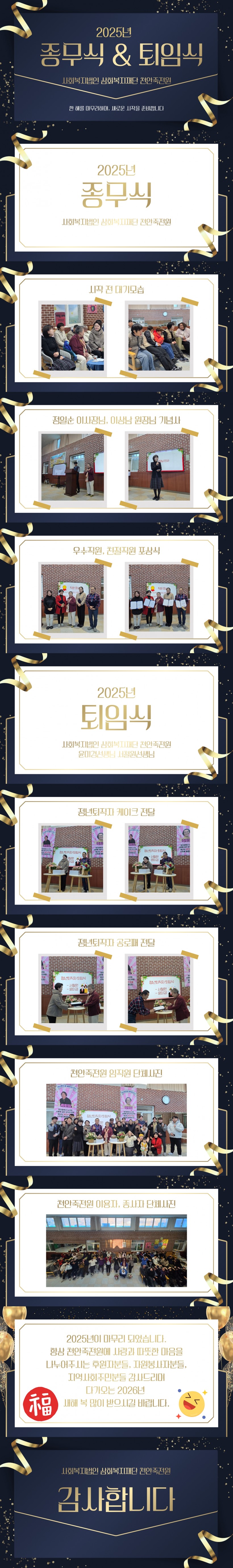 2025년 사회복지법인 삼화복지재단 천안죽전원 종무식 & 퇴임식 페이지 정보 작성자 운영자 작성일25-12-31 13:33 조회68회 댓글0건 관련링크 목록 본문 2025년 사회복지법인 삼화복지재단 천안죽전원 종무식 & 퇴임식을 진행하였습니다.항상 천안죽전원 가족분들의 얼굴에 웃음꽃이 활짝 피실 수 있는 죽전원이 되겠습니다!다가오는 2026년 새해 복 많이 받으세요!감사합니다. 댓글목록 등록된 댓글이 없습니다. 목록