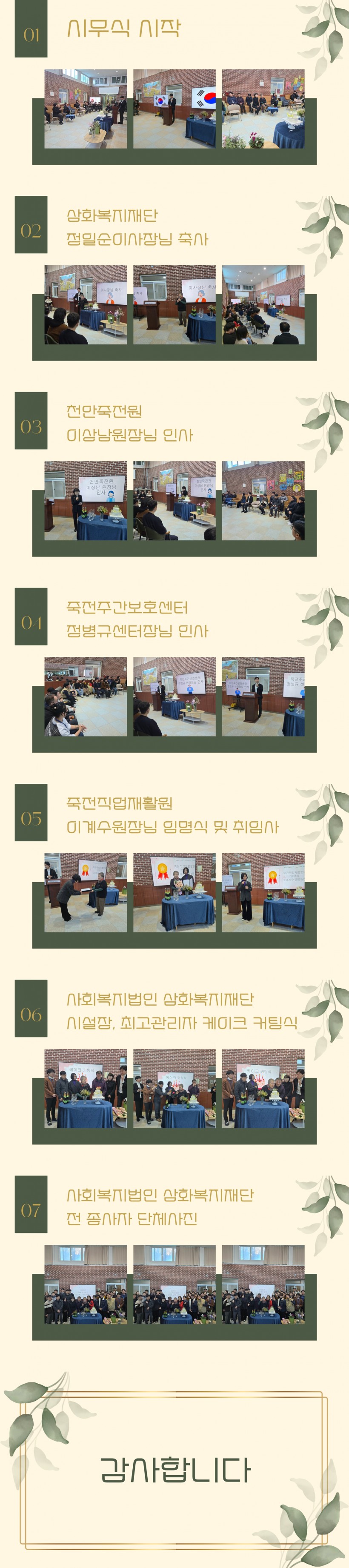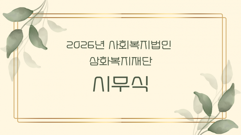 2026년 사회복지법인 삼화복지재단 시무식 페이지 정보 작성자 운영자 작성일26-01-02 17:56 조회153회 댓글0건 관련링크 목록 본문 2026년 사회복지법인 삼화복지재단 시무식 진행하였습니다.2025년 잘 마무리 진행하였고 새롭게 2026년 시작하였습니다.2025년에 사랑과 나눔, 후원, 봉사를 진행해주신 모든 분들께 감사드리며 2026년에도 잘 부탁드립니다.새해 복 많이 받으세요! 댓글목록 등록된 댓글이 없습니다. 목록