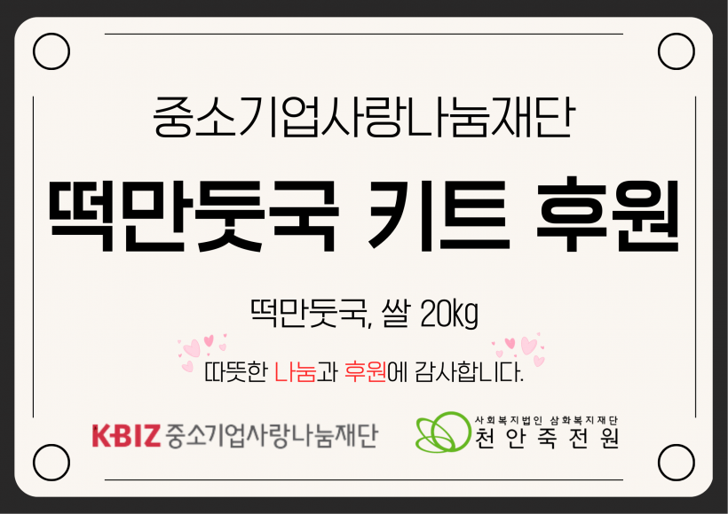 중소기업사랑나눔재단 떡만둣국키트, 쌀 후원 페이지 정보 작성자 운영자 작성일26-02-05 13:45 조회133회 댓글0건 관련링크 목록 본문 26.01.28.(수)중소기업사랑나눔재단 떡만둣국키트, 쌀 후원해주셨습니다.가족분들도 환하게 웃으시면서 맛있게 식사 하셨습니다.천안죽전원에게 사랑과 나눔을 해주신 중소기업사랑나눔재단에게 다시한번 감사의 말씀을 드립니다.감사합니다. 댓글목록 등록된 댓글이 없습니다. 목록