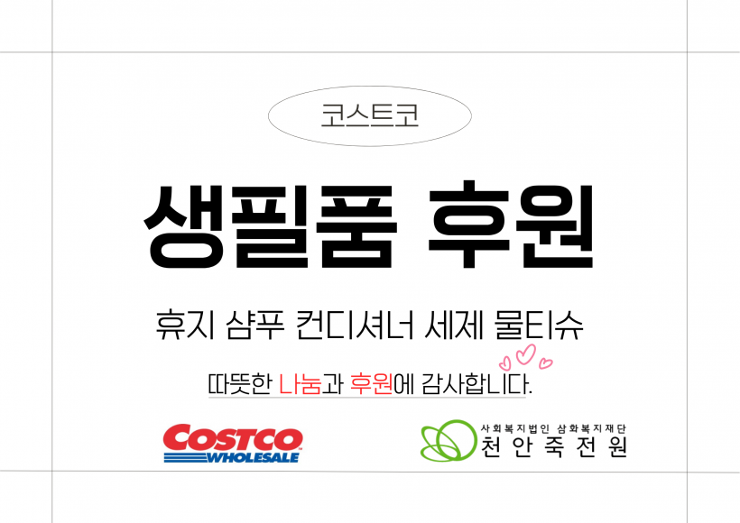 코스트코 생필품 후원 페이지 정보 작성자 운영자 작성일26-02-05 14:15 조회137회 댓글0건 관련링크 목록 본문 26.02.04.(수)코스트코 천안지점에서 휴지, 샴푸, 컨디셔너, 세제, 물티슈를 후원해주셨습니다.천안죽전원 가족분들이 일상생활에서 잘 사용하실 수 있도록 지원하겠습니다.천안죽전원에게 사랑과 나눔을 해주신 코스트코에게 다시한번 감사의 말씀을 드립니다.감사합니다. 댓글목록 등록된 댓글이 없습니다. 목록