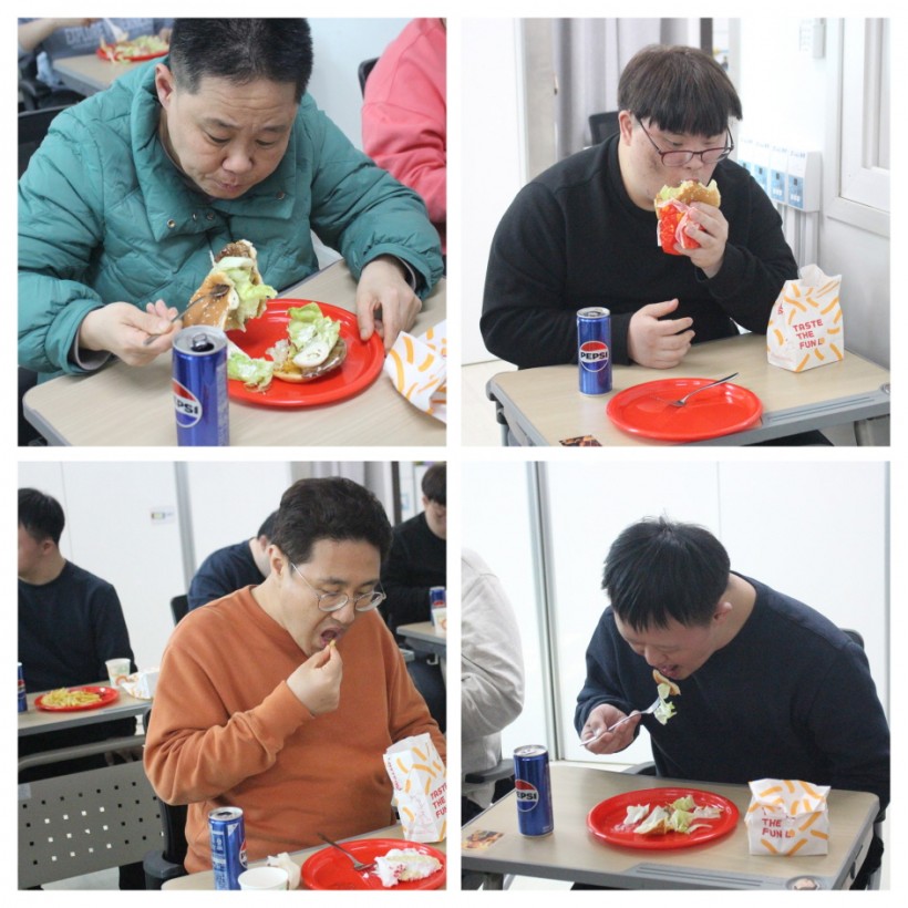 영상이 끝나자 모두가 한마음으로 생일 축하 노래를 부르며 주인공에게 따뜻한 축하를 전했습니다. 환한 웃음 속에서 촛불을 끄고, 케이크와 함께 샴페인으로 건배도 해보았습니다. 이어서 햄버거 간식까지 나누어 먹으며 즐거운 이야기꽃이 피어났습니다.